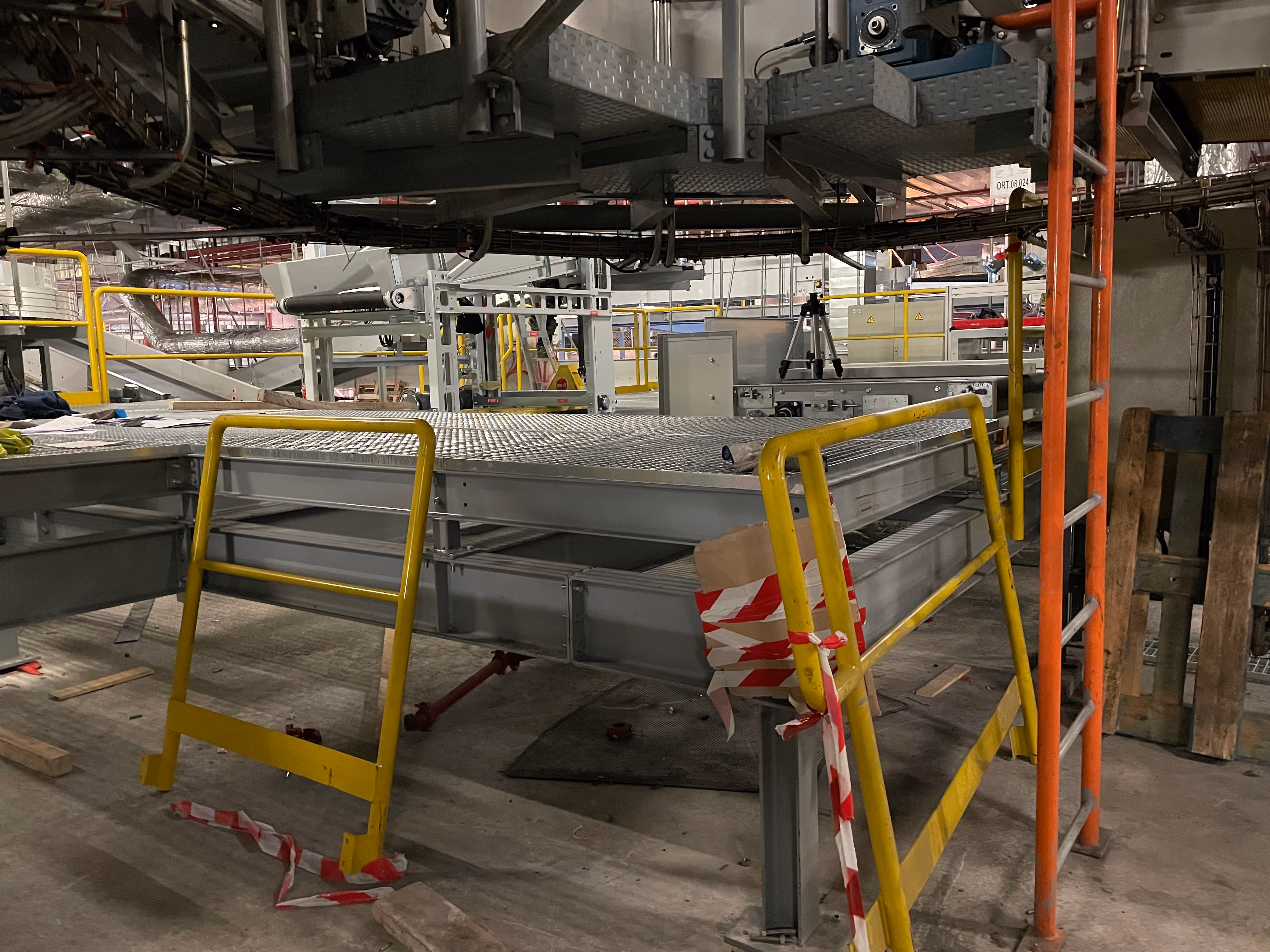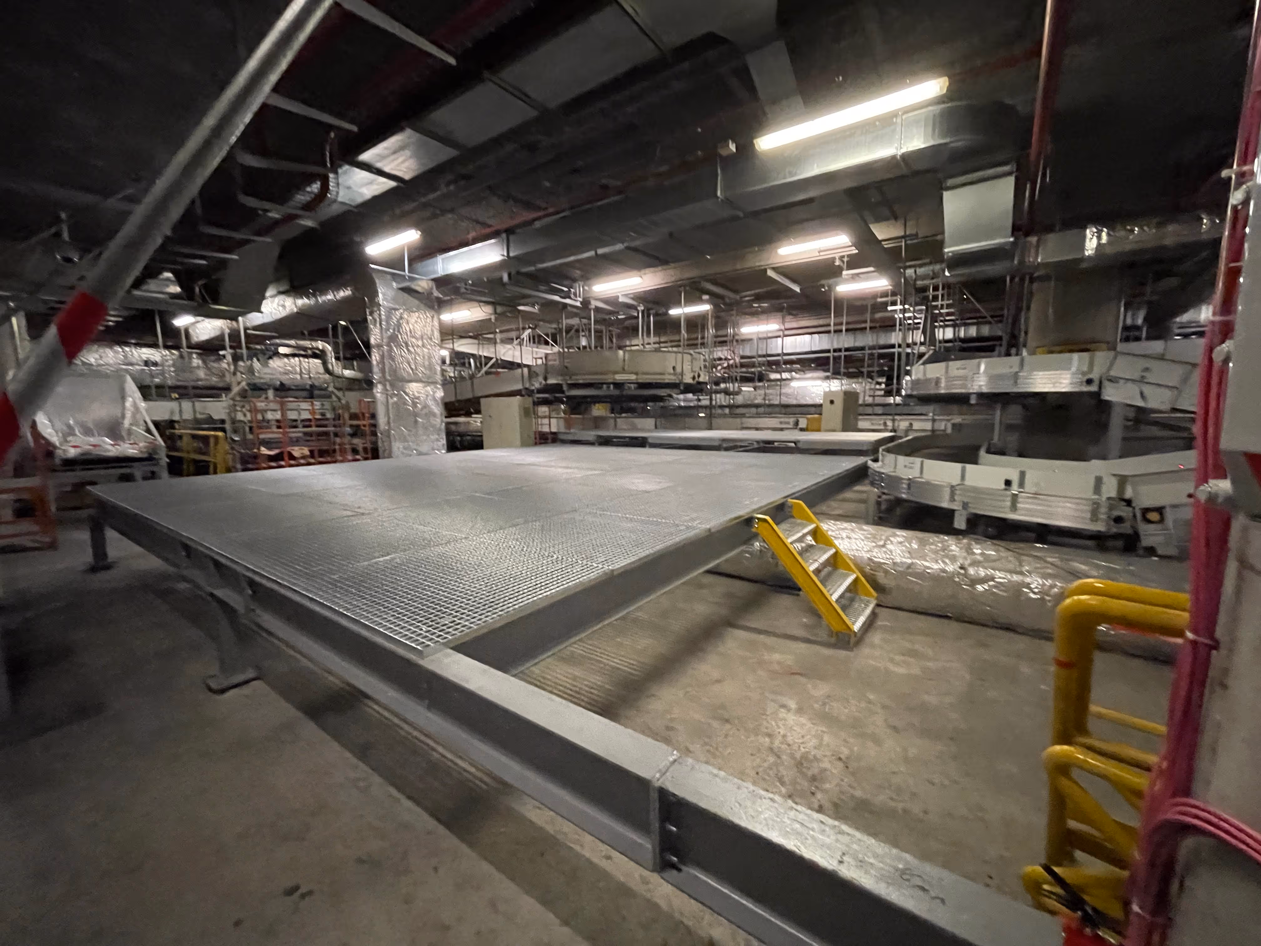Retirada de estructura antigua y fabricación e instalación de plataforma elevada de 90 m2 con suelo de tramex, escaleras de acceso y barreras de seguridad para posterior instalación de cintas mecánicas de transporte de equipajes y equipos de inspección.